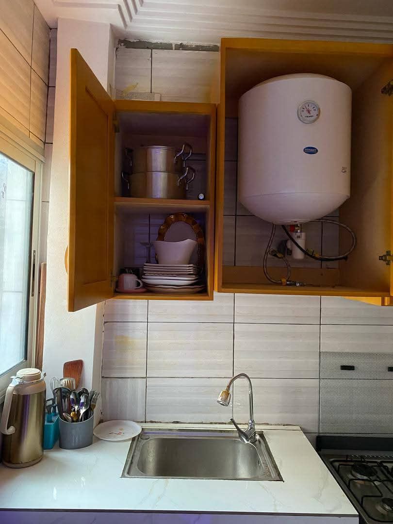 - Grande cuisine équipée avec meubles de rangement, balcon et buanderie